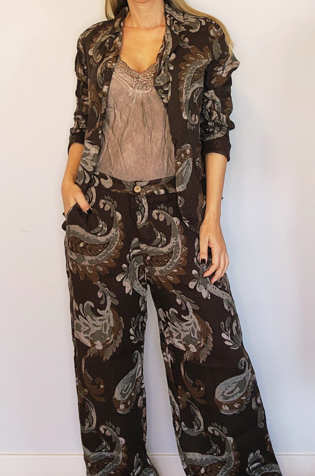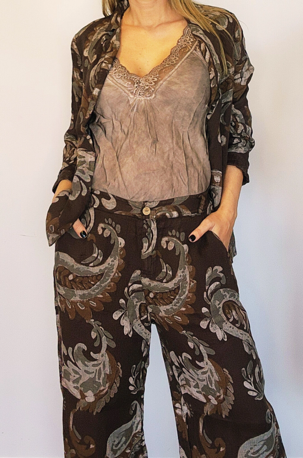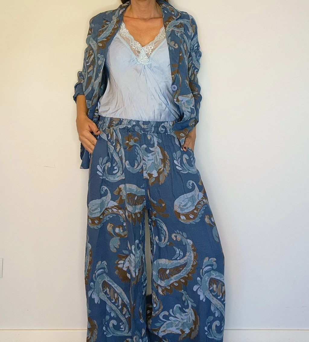 El Conjunto Atenas está confeccionado en 100% lino, proporcionando una frescura inigualable para el clima argentino. Este conjunto incluye un pantalón Palazzo con cintura elastizada que se adapta a tu figura.