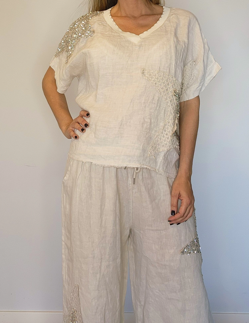 El Conjunto Cerdena está confeccionado en 100% lino, proporcionando una frescura inigualable para el clima argentino. Este conjunto incluye un pantalón Palazzo con cintura elastizada que se adapta a tu figura.