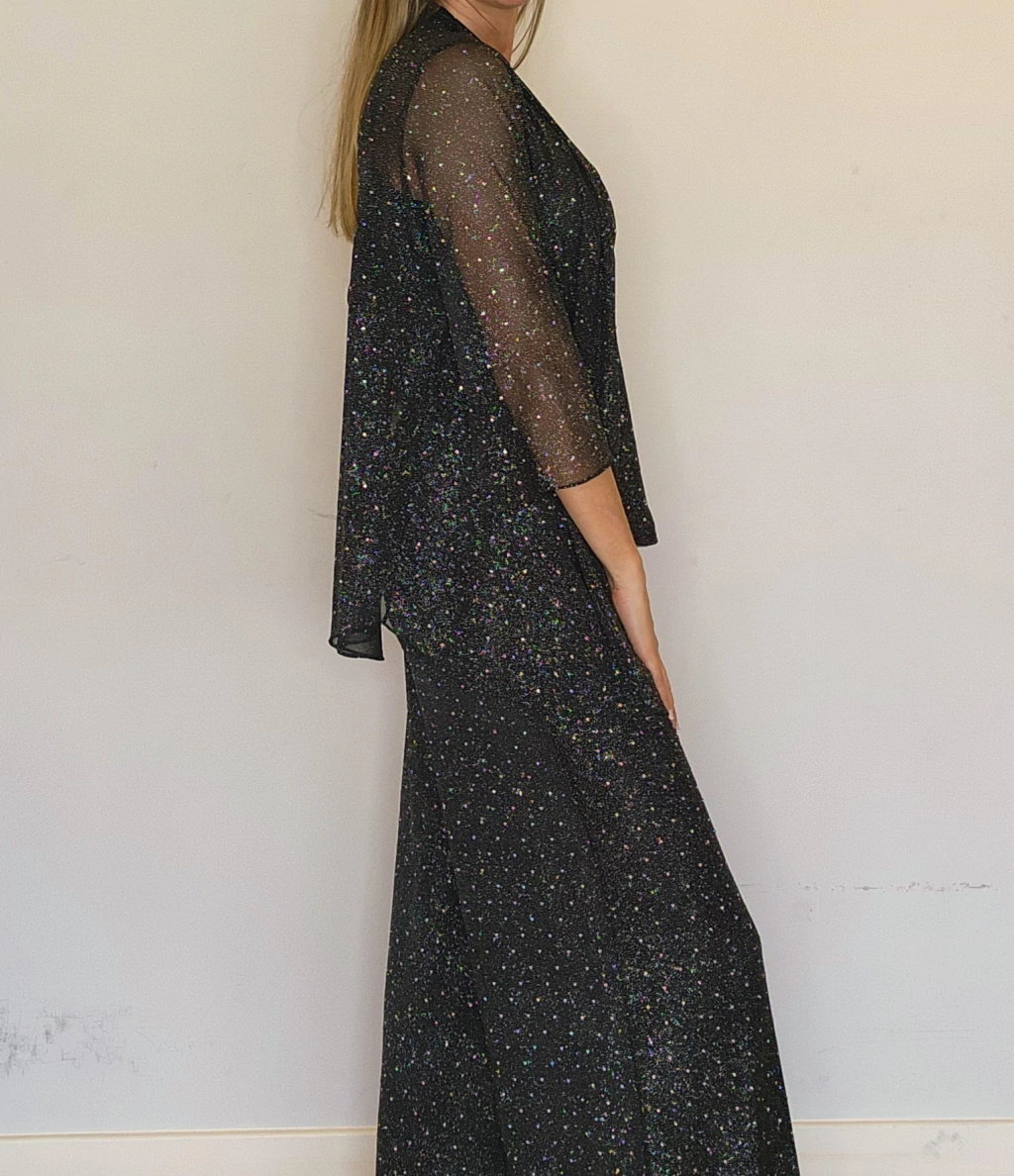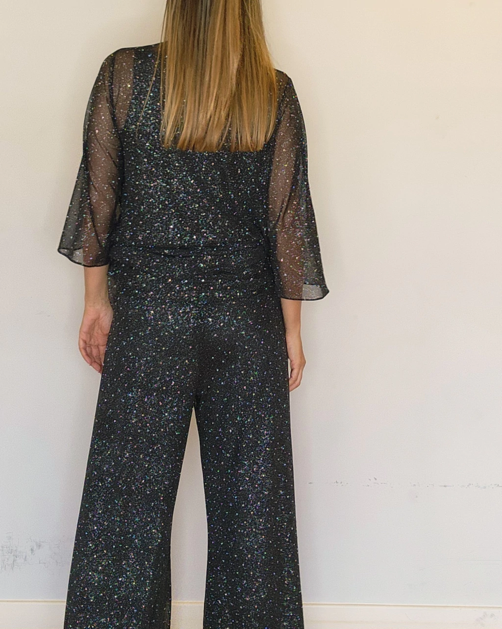 Este conjunto en tull con strass, completamente forrado en jersey, es ideal para cualquier ocasión. Incluye palazzo, musculosa y spolverino, que podés elegir en tu talle para un ajuste perfecto.